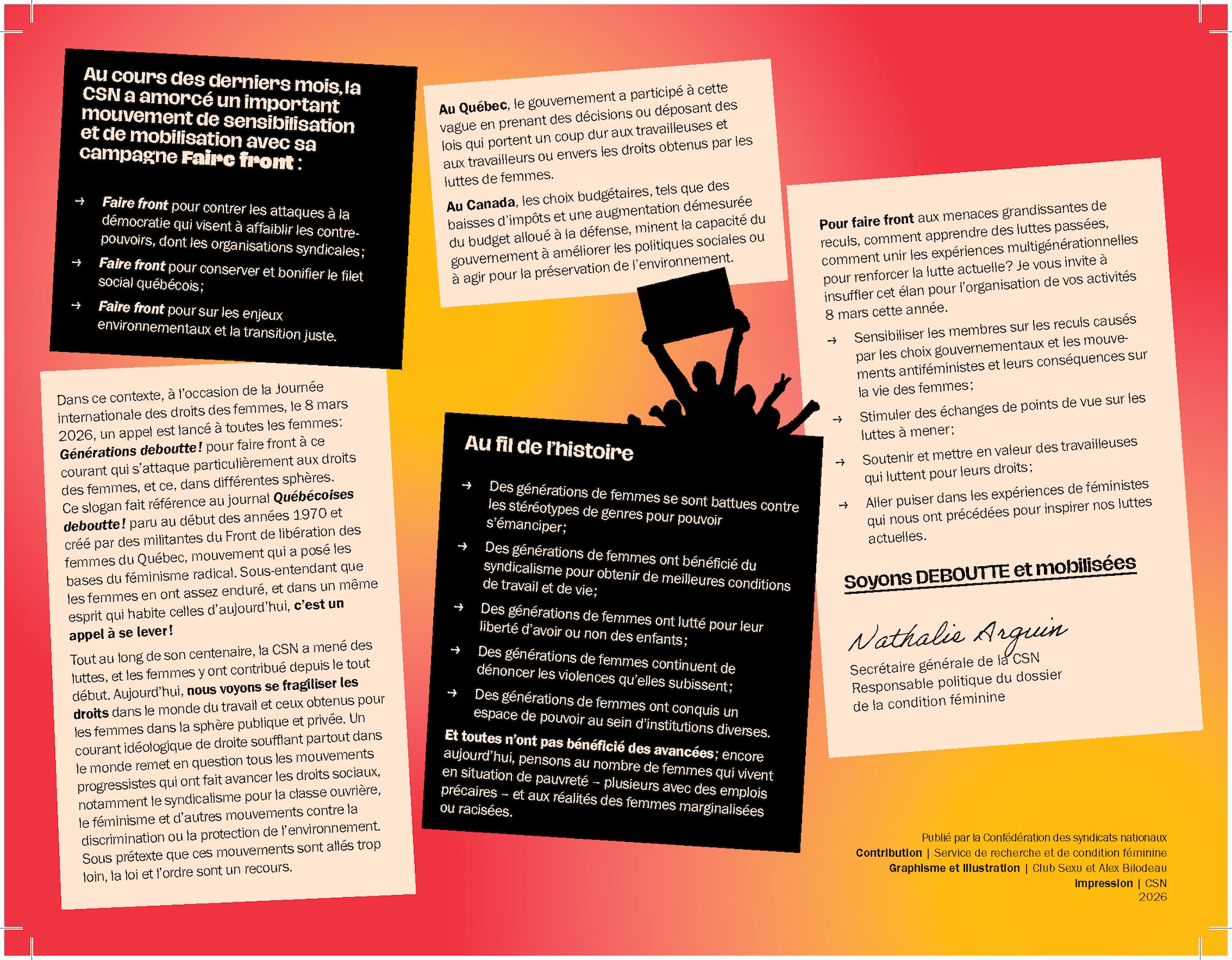 Le matériel du 8 mars 2025 (affiche, autocollants et signets CSN) sera envoyé dans les syndicats affiliés à la CSN au début de février. Les syndicats affiliés peuvent commander des épinglettes en communiquant avec leur conseil central.
