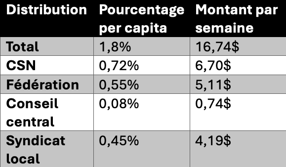 D’autres parties de la cotisation vont à la CSN, au palier régional ainsi qu’au secteur d’emploi, soit à la fédération à laquelle le syndicat est affilié.