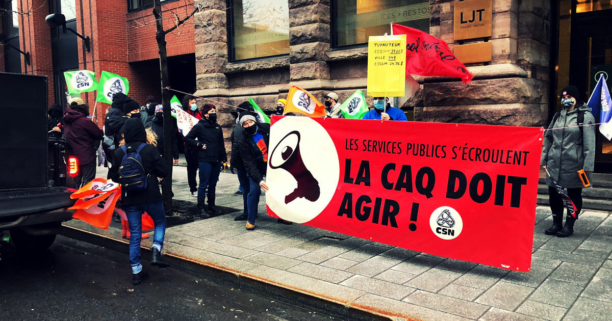 Tôt ce matin, des travailleuses et des travailleurs des services publics, membres de la CSN, ont manifesté devant les bureaux du ministre des Finances, Éric Girard, à Montréal. Munis d’une grande bannière sur laquelle on pouvait lire « Les services publics s’écroulent. La CAQ doit agir! », les militantes et les militants présents en avaient long à dire sur le manque de courage politique du gouvernement pour régler la crise qui perdure dans les réseaux depuis des années.