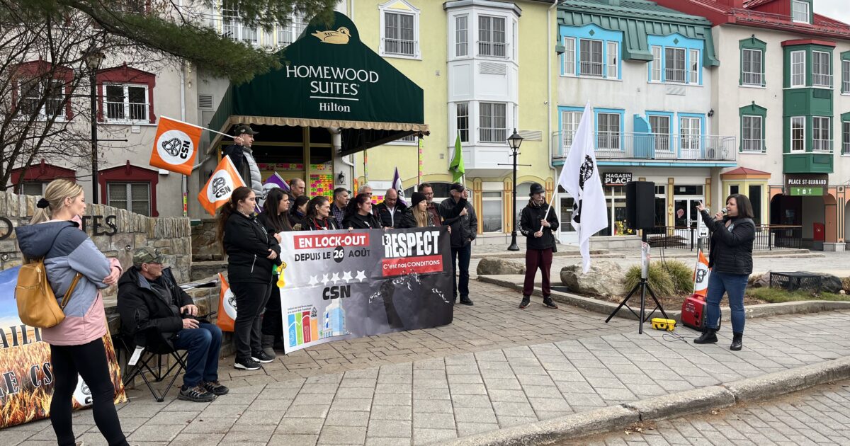 En lock-out depuis le 26 août dernier, les employé-es du Hilton Homewood Suites de Tremblant sont sans convention collective depuis le 30 juin. La section Hilton du Syndicat des travailleuses et travailleurs de la Station Mont-Tremblant–CSN regroupe 24 salarié-es, alors que le syndicat général représente les 900 employé-es des différentes installations de la montagne. Fondée en 1921, la CSN regroupe 330 000 travailleuses et travailleurs des secteurs public et parapublic, et ce, dans l’ensemble des régions du Québec.