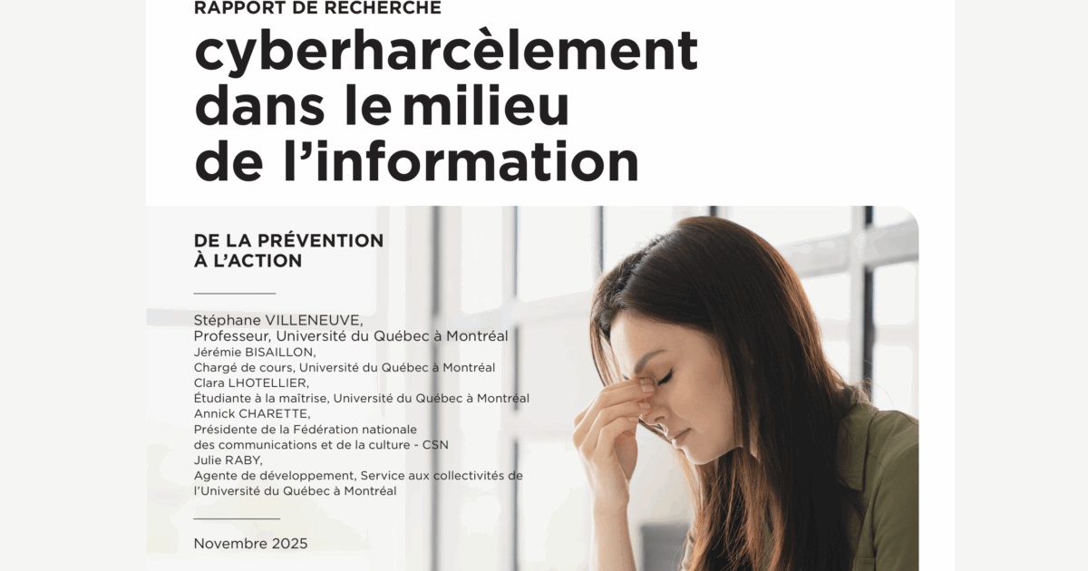 Réalisée conjointement par la FNCC–CSN, le Service aux collectivités de l’UQAM et la Faculté des sciences de l’éducation de l’UQAM, l’étude intitulée Cyberharcèlement dans le milieu de l’information : de la prévention à l’action a été réalisée par les chercheurs Stéphane Villeneuve, Jérémie Bisaillon et Clara Lhotellier, respectivement professeur, chargé de cours et étudiante à la maîtrise au Département de didactique de l’UQAM, auprès de 12 gestionnaires de 8 médias de différentes tailles du Québec.
