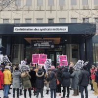 Cette initiative a été prise par les comités de la condition féminine de la CSN et du Conseil central du Montréal métropolitain (CSN) ainsi que par le comité femmes du STTCSN. Comme ces comités ne font pas les choses à moitié, ils ont également accroché une bannière à l’entrée du bâtiment où on peut lire : ” Les femmes de la CSN seront Féministes tant qu’il le faudra! ” Cette bannière sera utilisée dans les actions de la CSN à venir sur tout sujet qui concerne les femmes.
