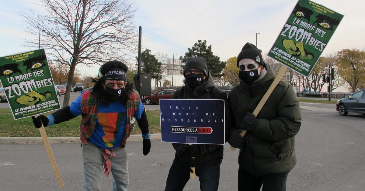 Cette année, la pandémie a fait naître une catégorie de créatures encore jamais observées au Québec : les ZOOMbies ! Ce matin, en effet, des centaines de profs de cégep de la Fédération nationale des enseignantes et des enseignants du Québec (FNEEQ-CSN) sortent de leurs écrans et des nombreuses plateformes virtuelles d’enseignement qui les ont transformés en ZOOMbies pour grogner leur désarroi devant les bureaux du ministère de l’Enseignement supérieur (MES) à Montréal et à Québec ainsi que dans des cégeps de toutes les régions de la province. Aucun maquillage n’est cependant nécessaire tant leurs yeux sont cernés et leur dos est voûté par la surcharge de travail. Les ZOOMbies manifestent en appui aux porte-parole de la FNEEQ-CSN, qui revendiquent au même moment des ressources supplémentaires au MES.