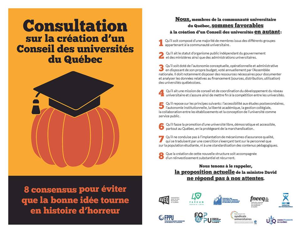 Des organisations syndicales et étudiantes s’entendent sur huit grands consensus devant guider la création d’un Conseil des universités du Québec (CUQ), considérant que le contenu du document de consultation de la ministre de l’Enseignement supérieur, Madame Hélène David, ne répond pas à leurs attentes.