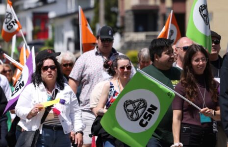 (12 juin 2024) Réunies en instance à Shawinigan, plusieurs centaines de membres de la CSN ont marché dans les rues de la ville pour se rendre devant le bureau de la députée.