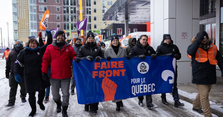Plus de 300 militantes et militants de la CSN ont manifesté devant les bureaux du ministre du Travail pour dénoncer la dérive autoritaire du gouvernement caquiste….
