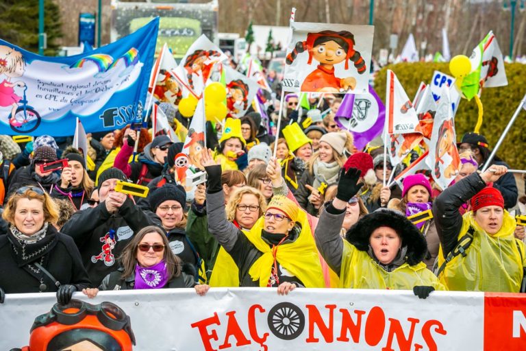 Quelque 2000 travailleuses en grève venant d’une centaine de CPE de l’Estrie, du Cœur du Québec et de Montréal-Laval ont manifesté devant le CPE géré par la présidente…