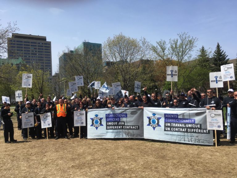Près de 200 membres du Syndicat des agents correctionnels du Canada (UCCO-SACC–CSN) manifestent aujourd’hui devant le Secrétariat du Conseil du Trésor du Canada, à Ottawa. Près de trois…